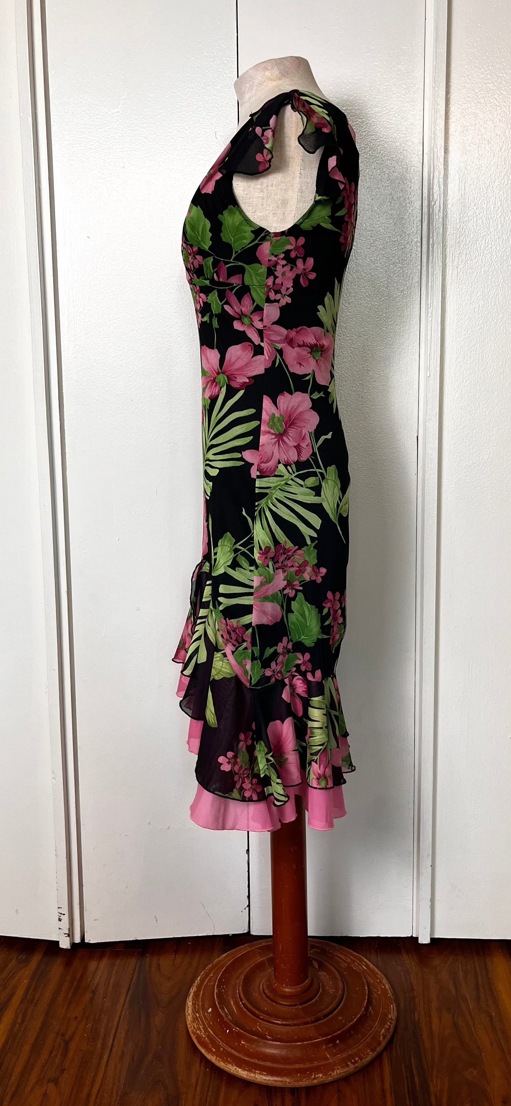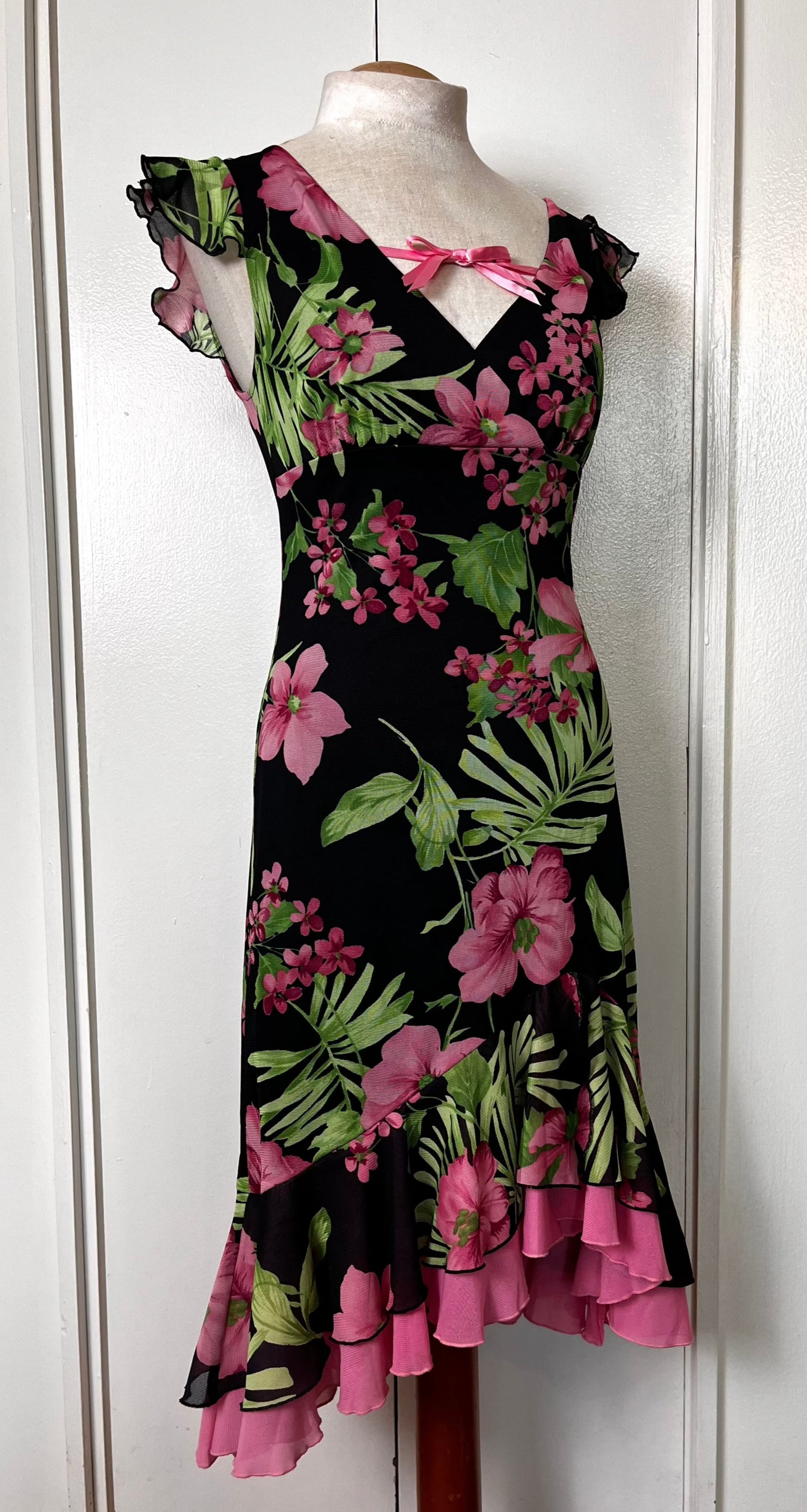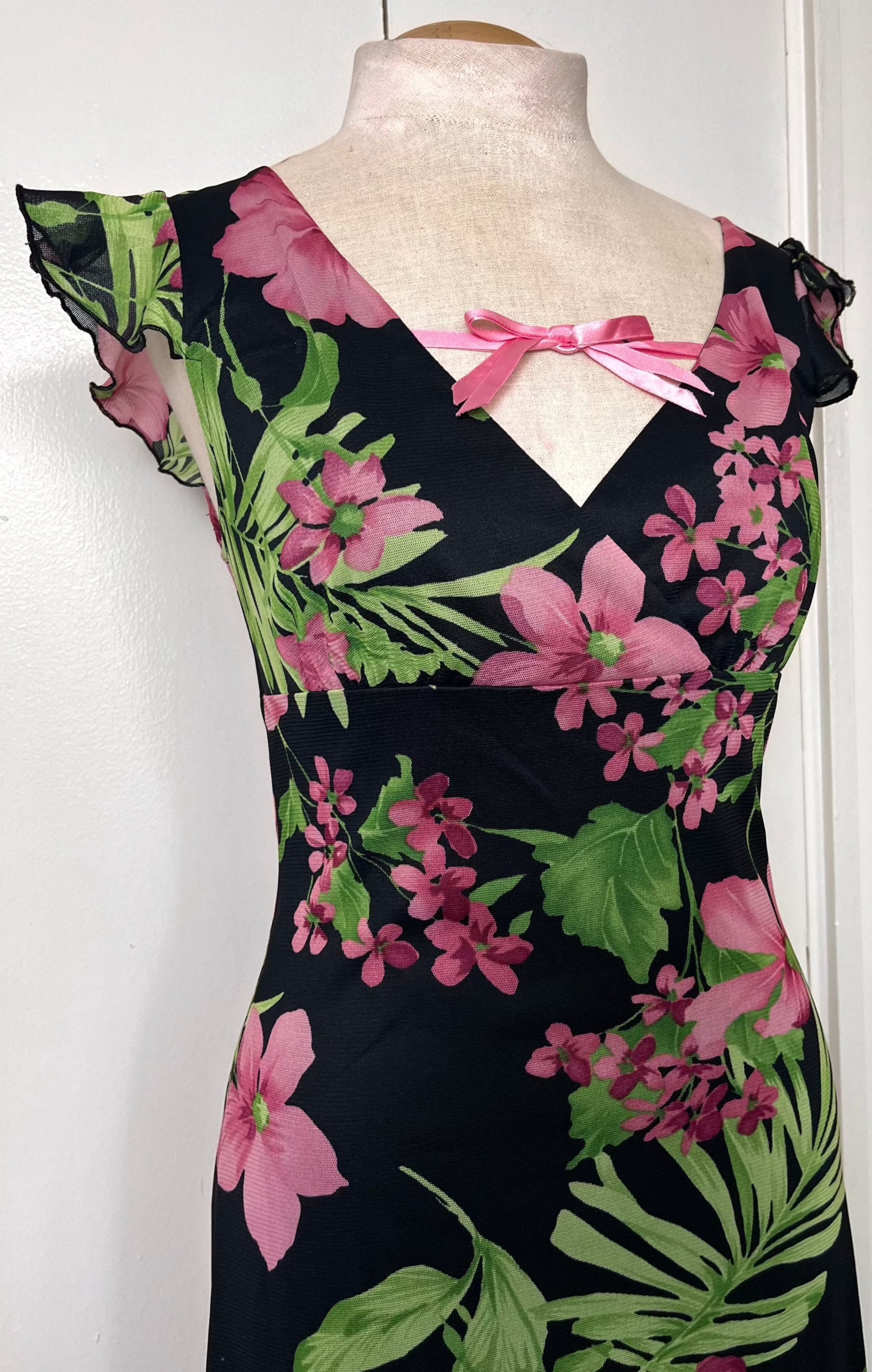 Vintage 1990's "City Triangles" Black, Pink & Green Floral Flutter Sleeve & Ribbon Dress