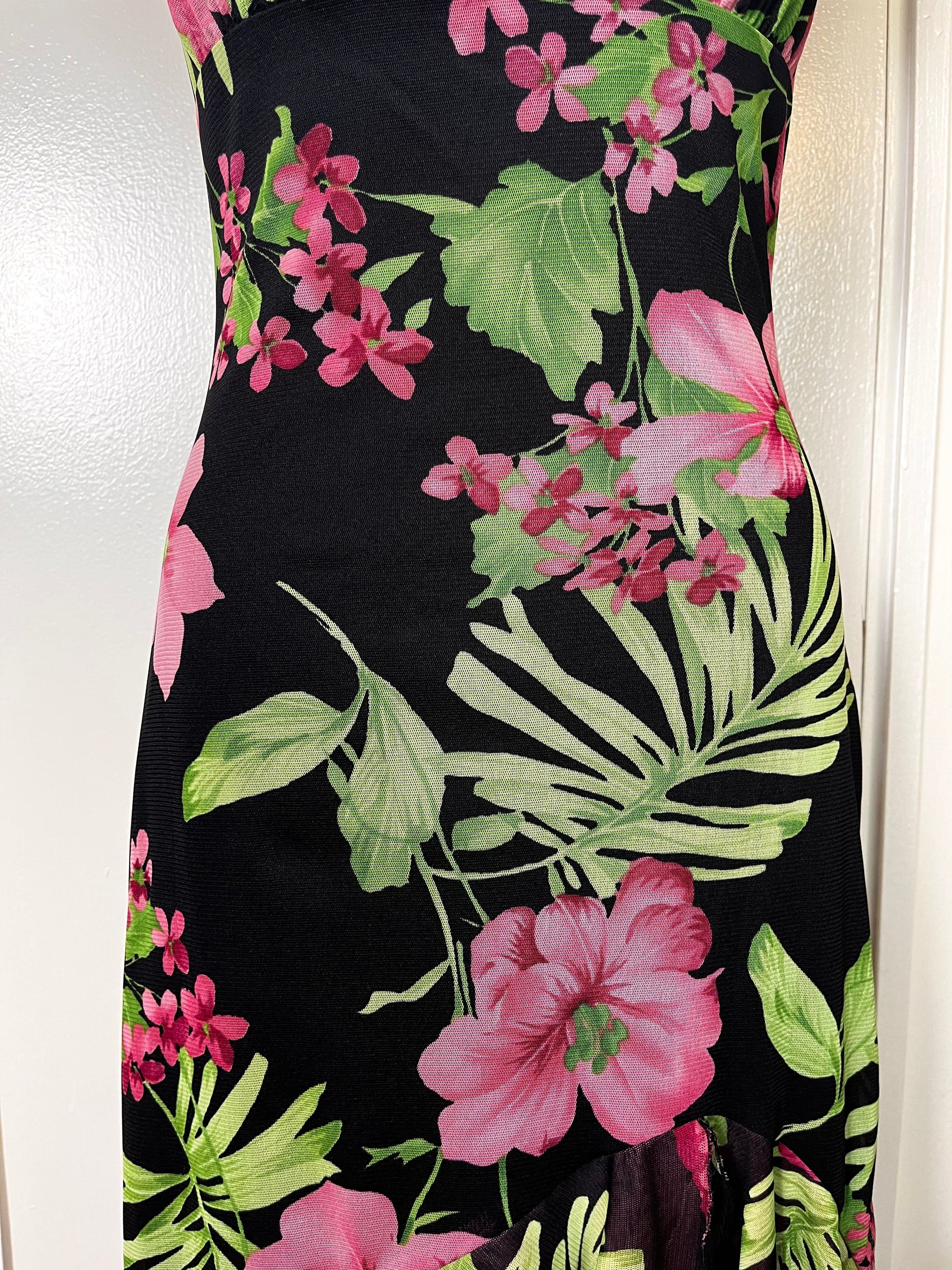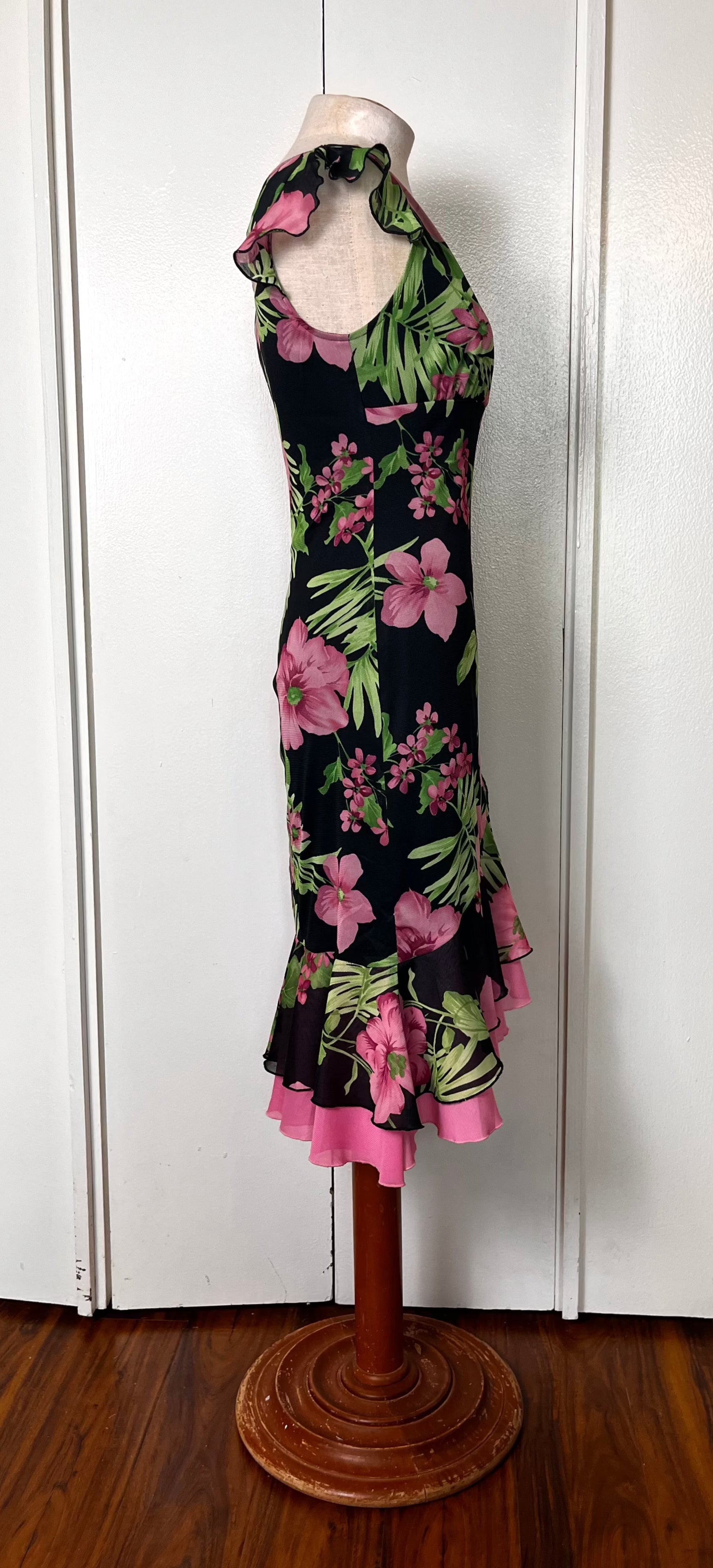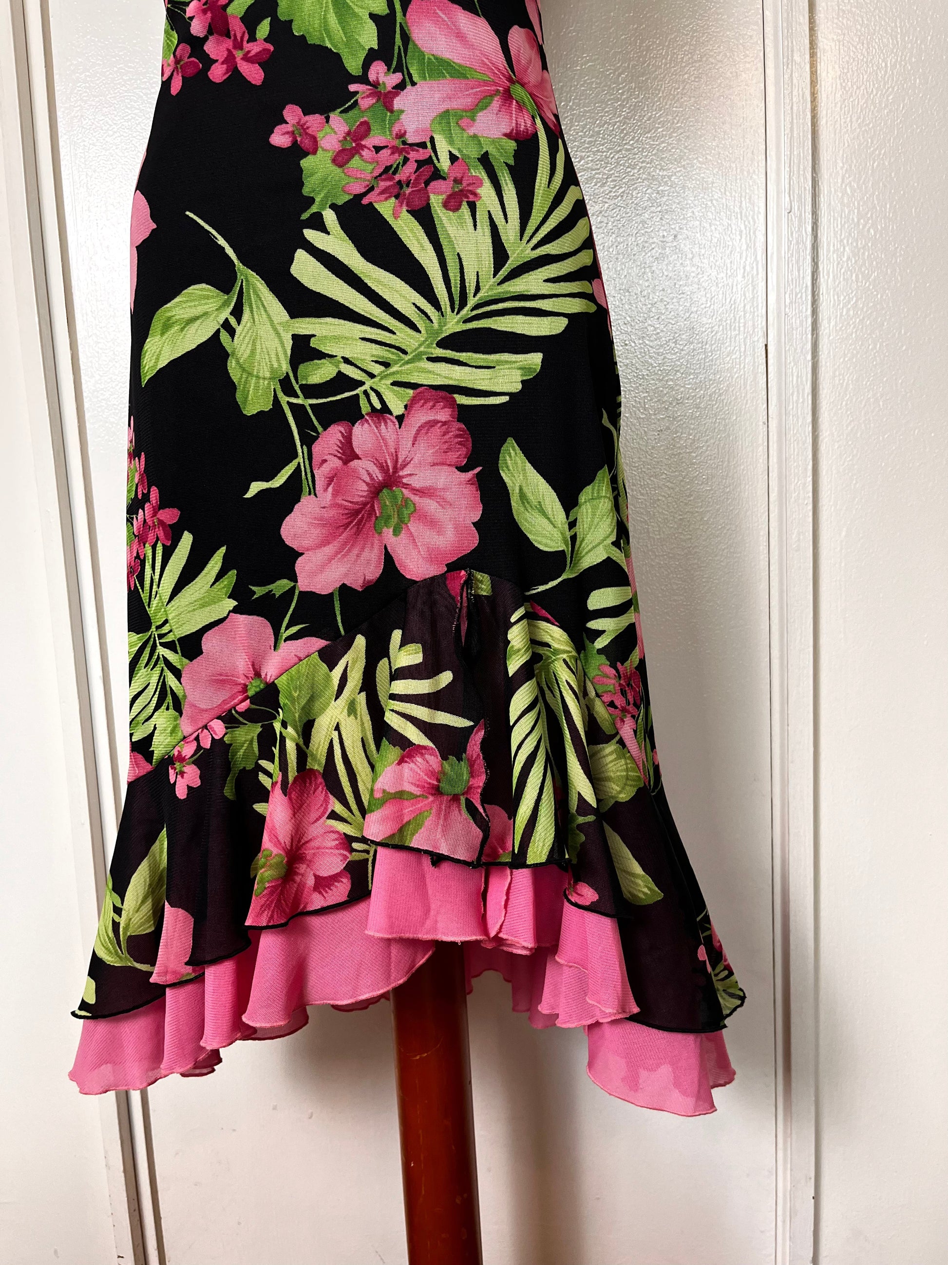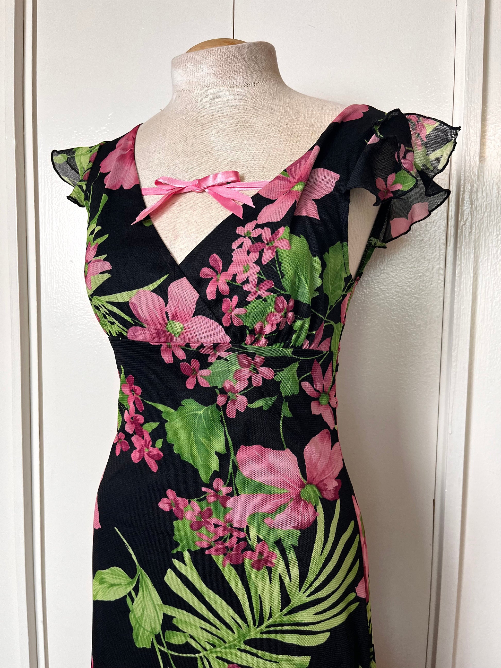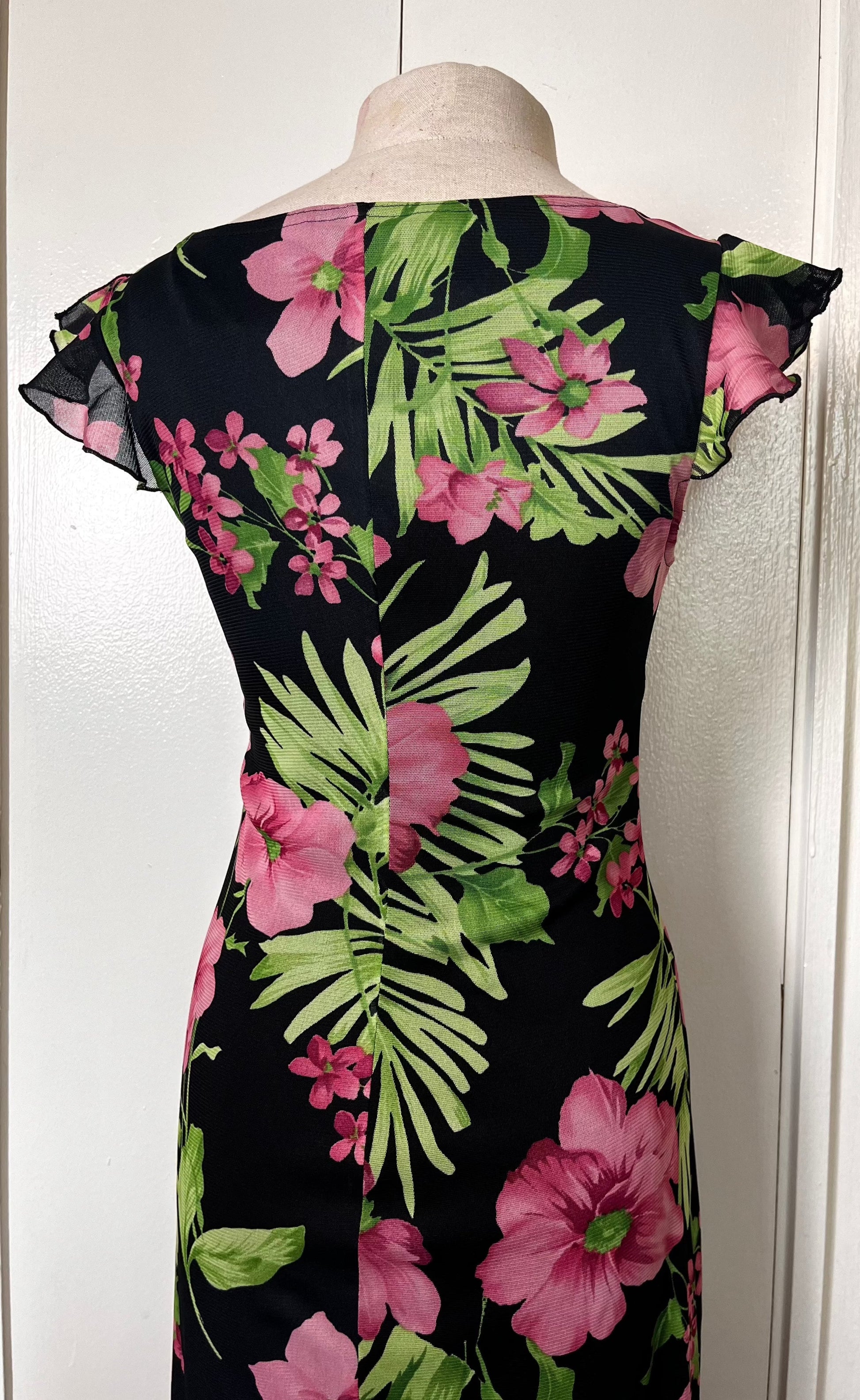 Vintage 1990's "City Triangles" Black, Pink & Green Floral Flutter Sleeve w/ Flounce & Ribbon Mesh Midi Dress