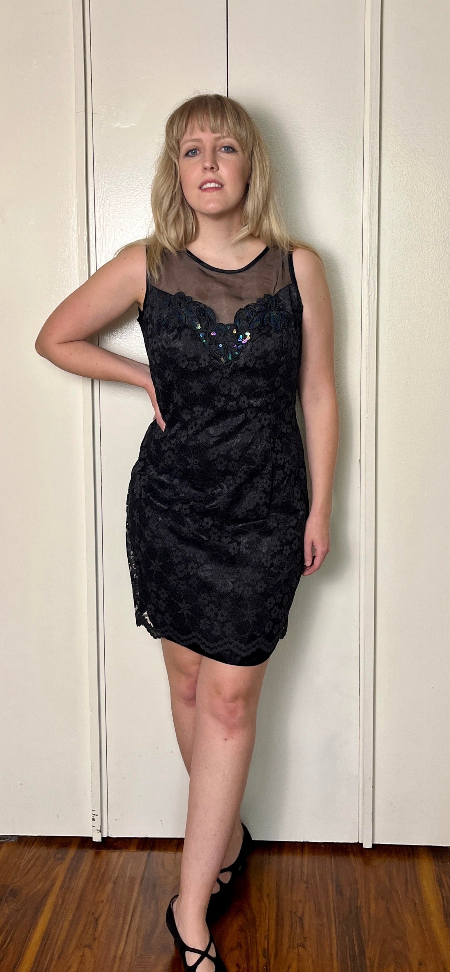 Vintage 1990's "Gunne Sax by Jessica McClintock" Black Lace with Oil-Slick Sequins Mini Dress