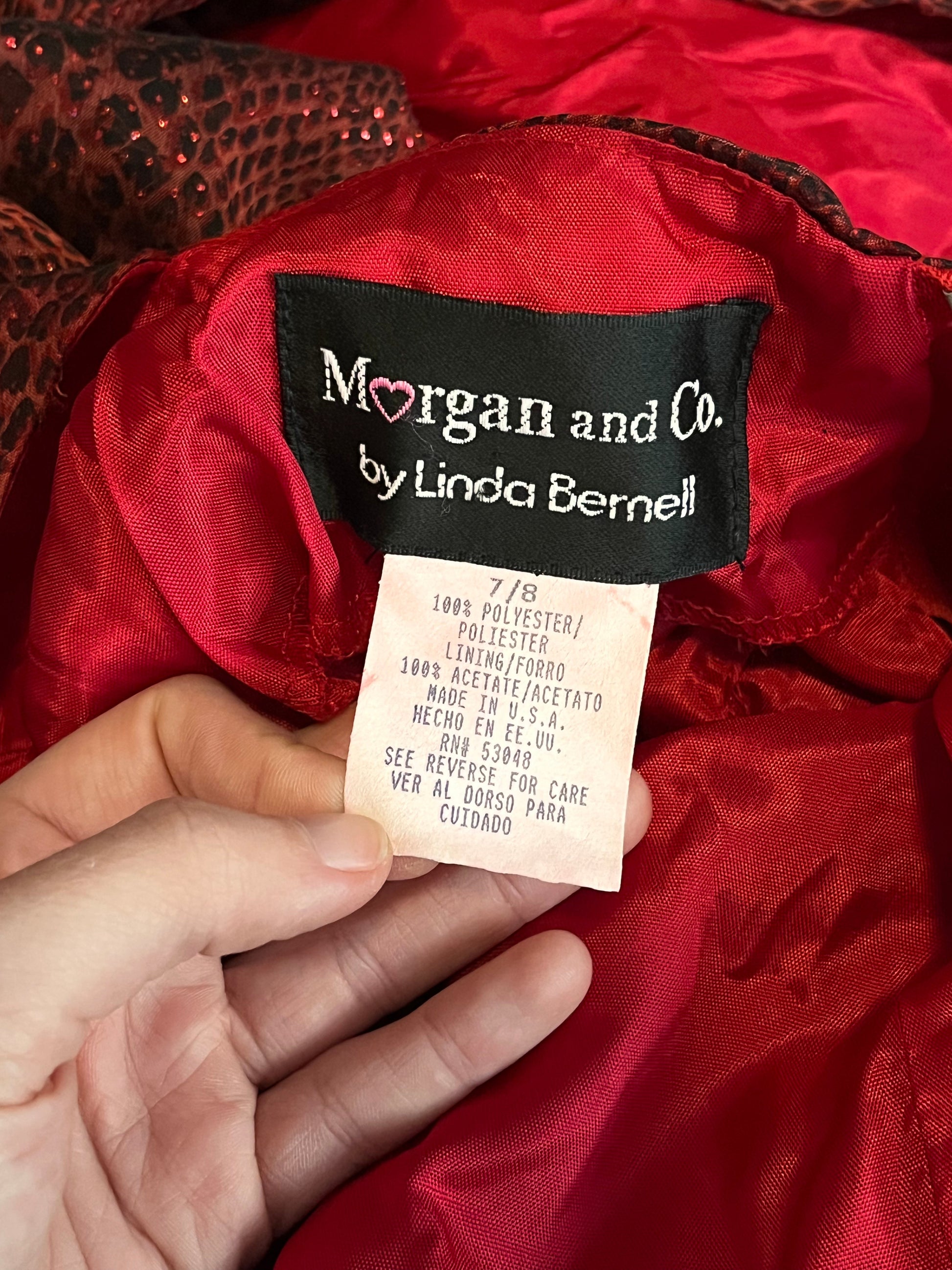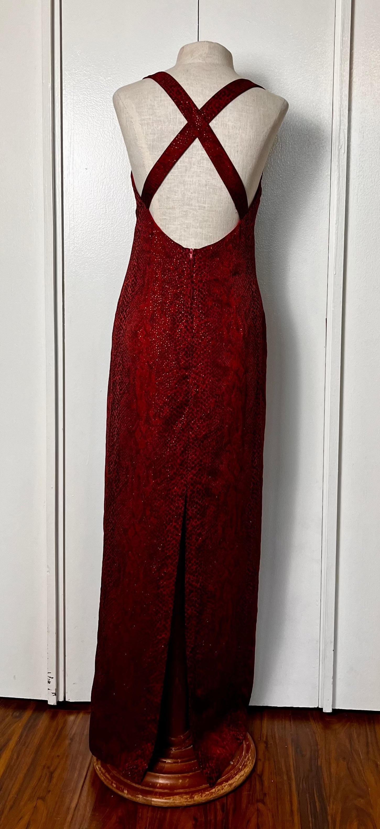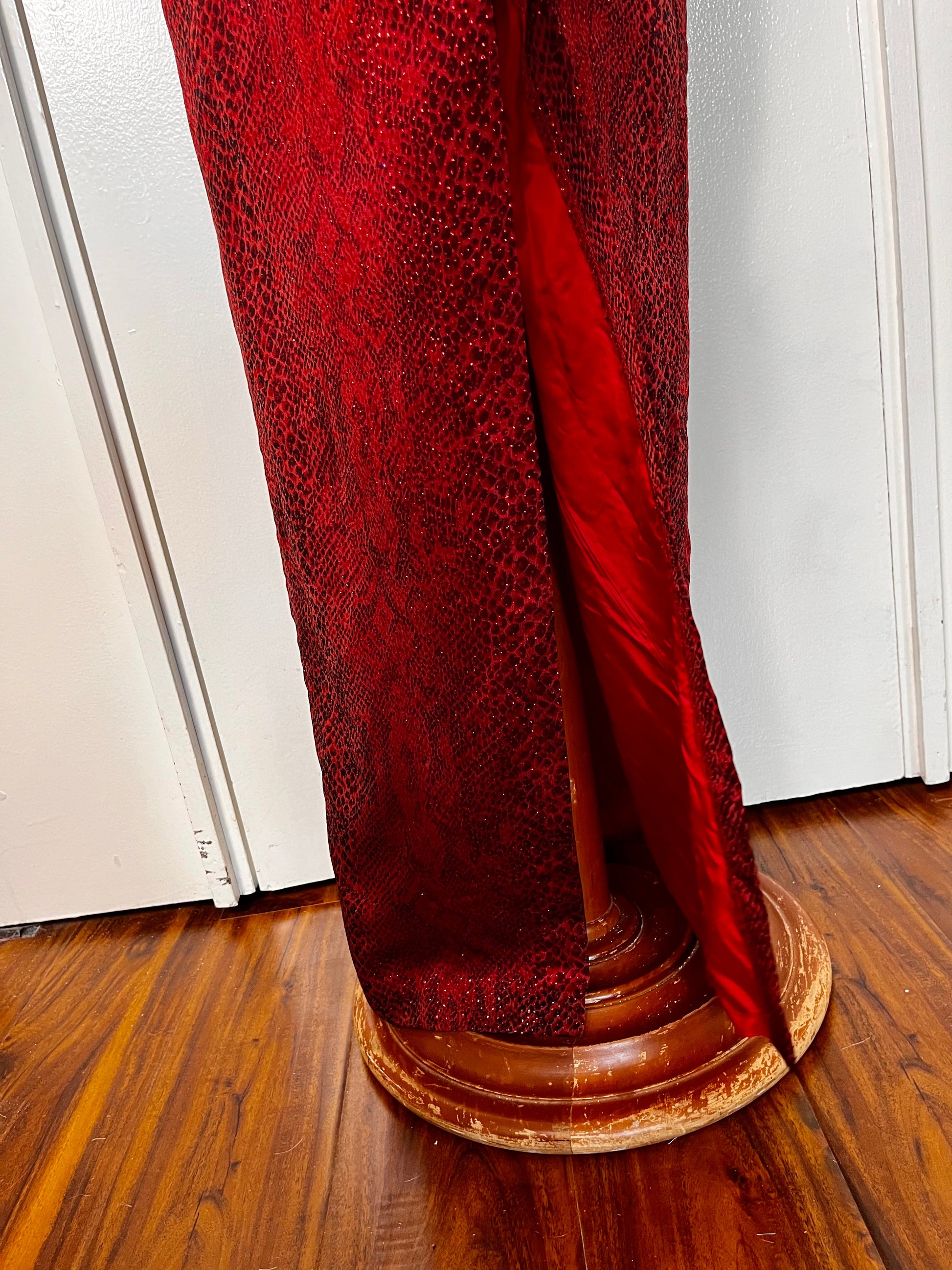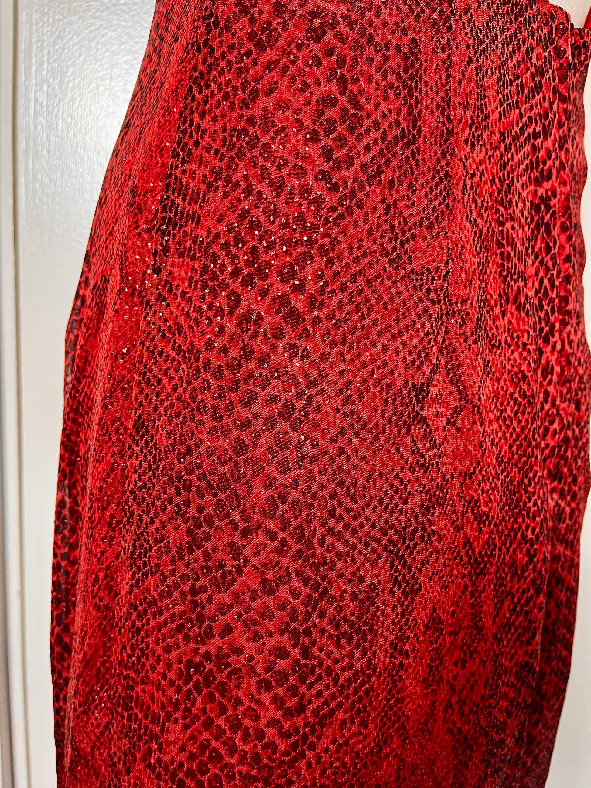 Vintage 1990's Red & Black Shimmery Snake Print Criss-Cross Back Maxi Dress w/ Back Slit
