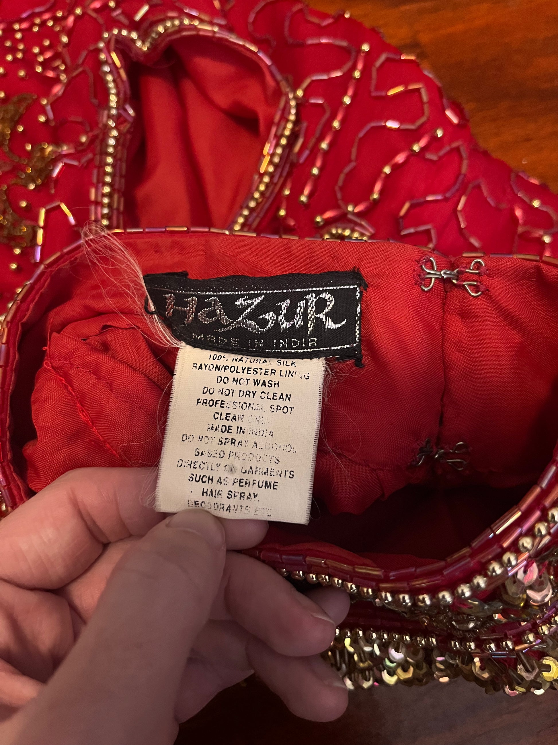 Fair condition; please see last 4 photos for reference. There is a small section at the front of the dress where the beads are missing. There is a small amount of stress-seaming at the side seams. There is a small imperfection on the back torso of the dress.