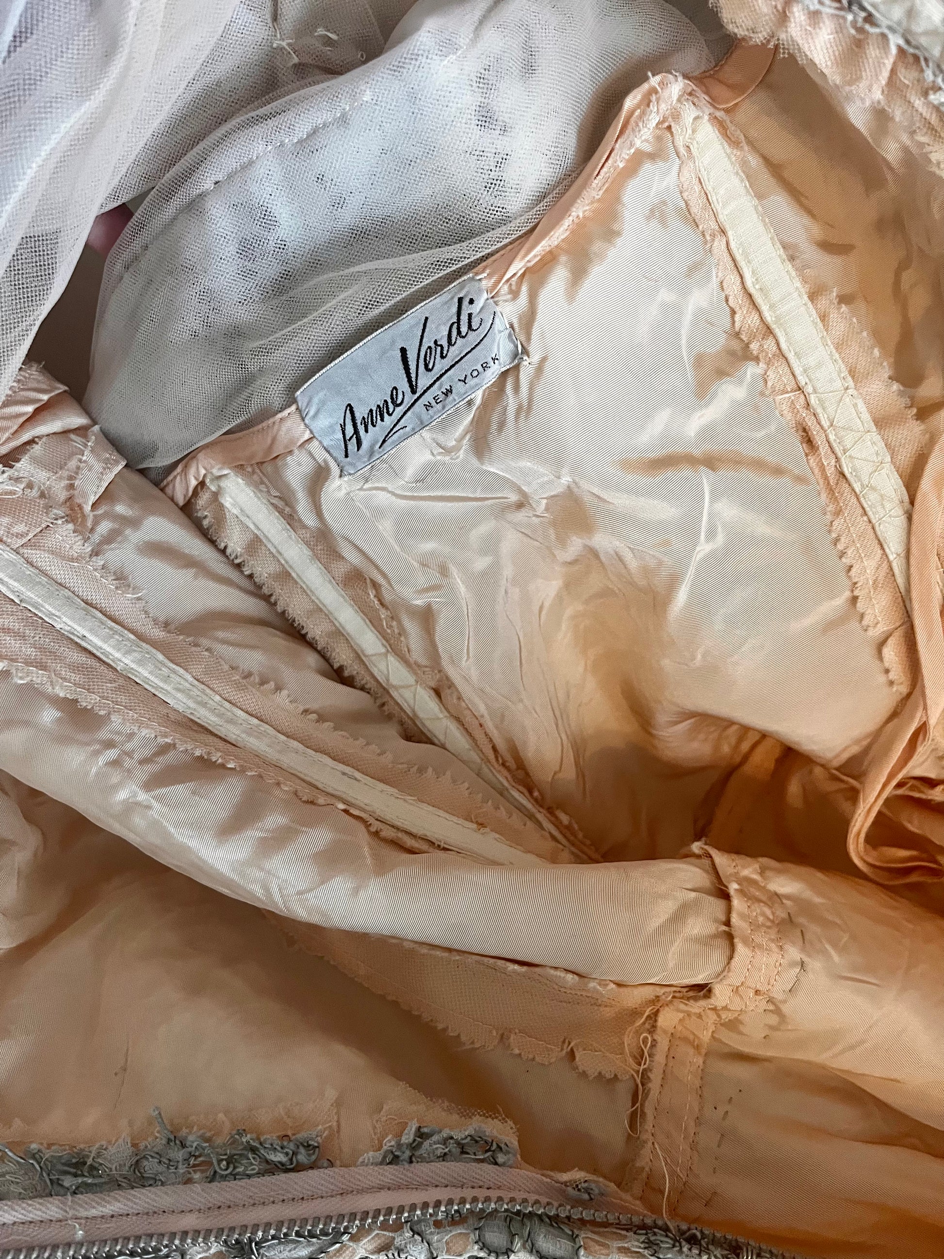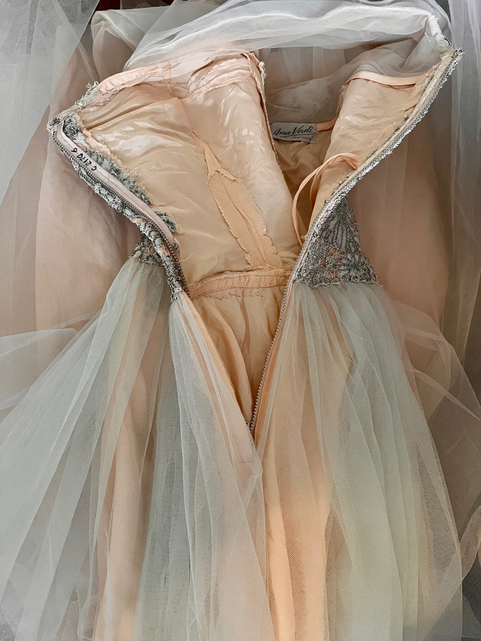 This dress was design by Italian-American designer Anne Verdi, a famous dressmaker from the 1950's who even patented many of her cocktail and evening gown designs. The gown is constructed with varying shades of blush pink and "Tiffany" blue shades of tulle, with a subtle blue lace finish on the bodice. The lining is composed of a satin-like finish and has boning to create an immaculate shape on the body.