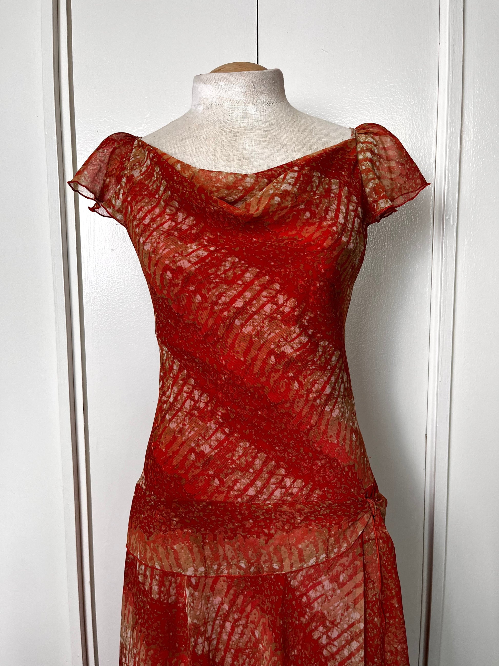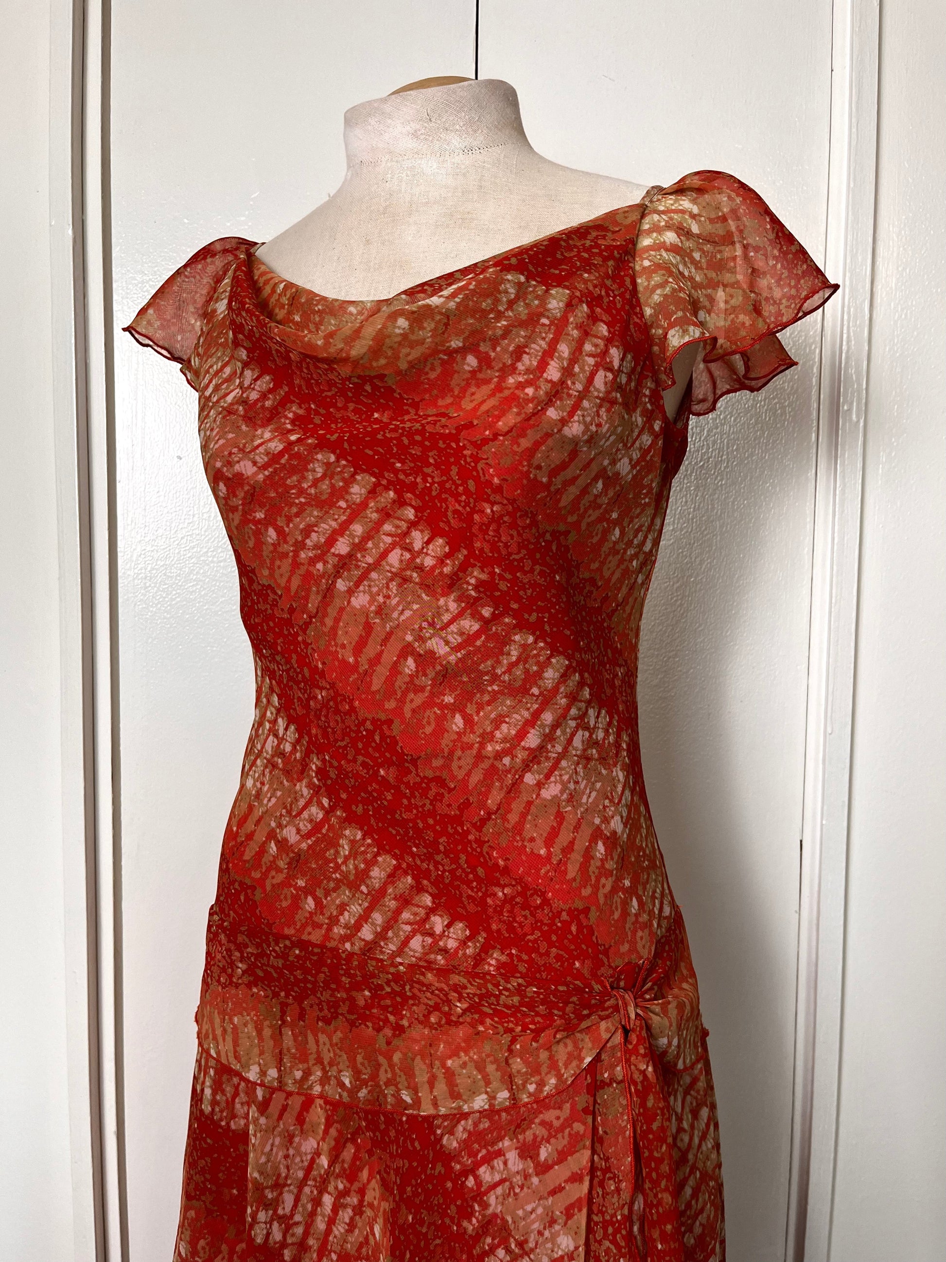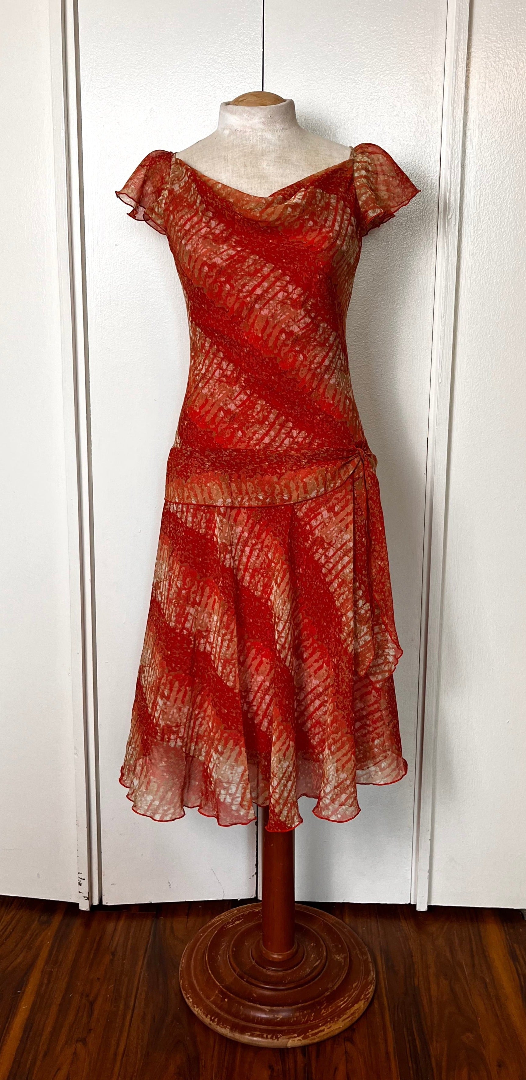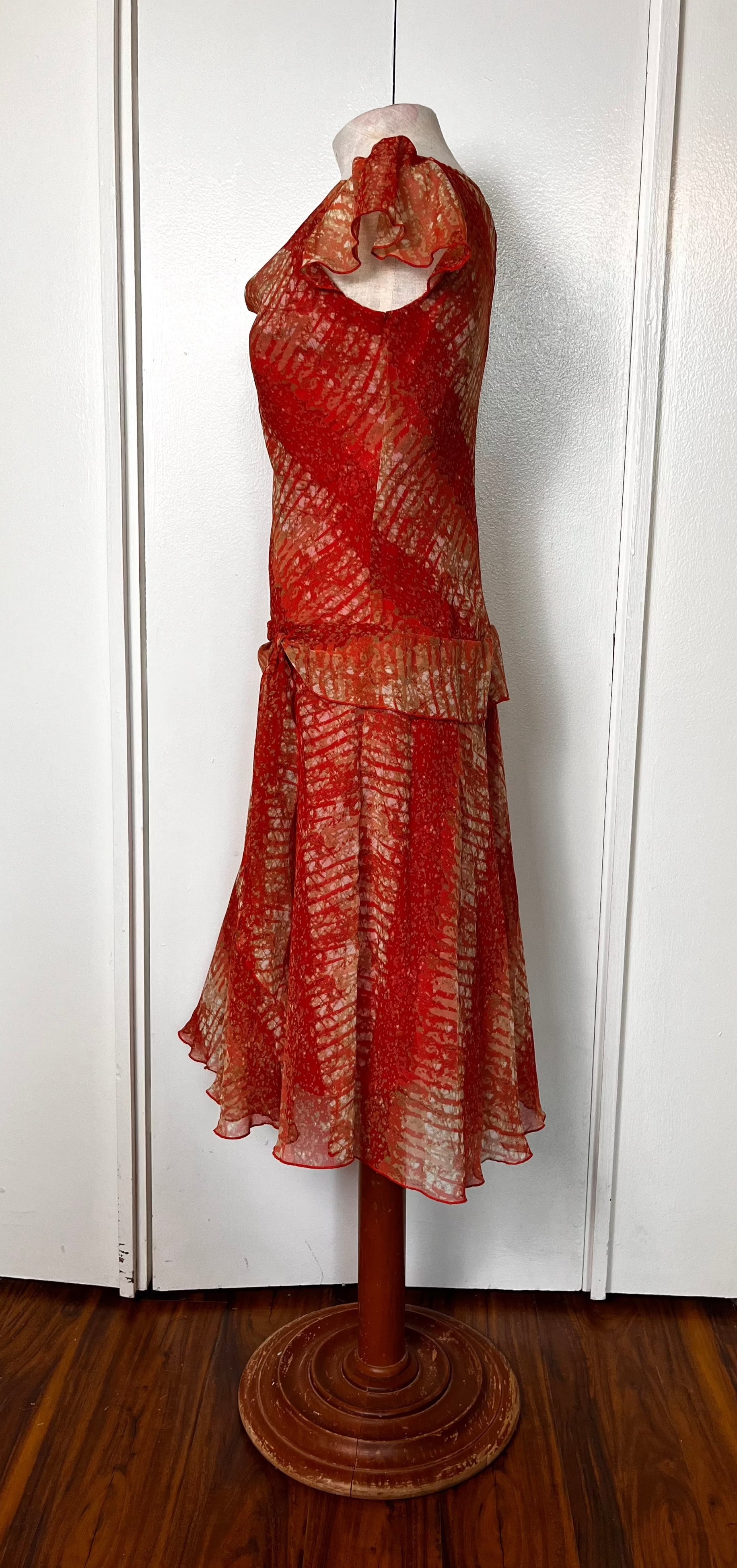 Vintage Y2K "Jonathan Martin" Red-Orange Drop-Waist Flutter Midi Dress