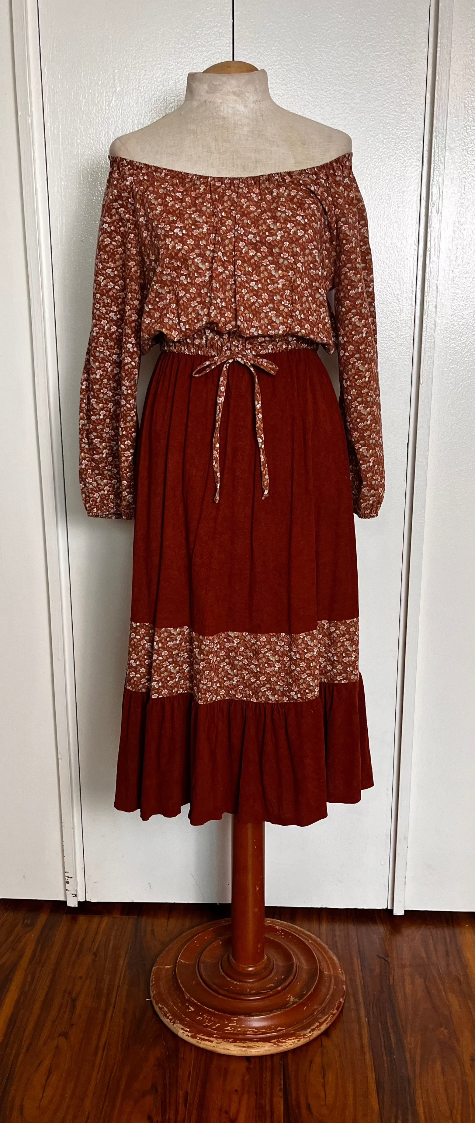 Vintage 1970's Terracotta-Rust Calico Prairie Midi Dress